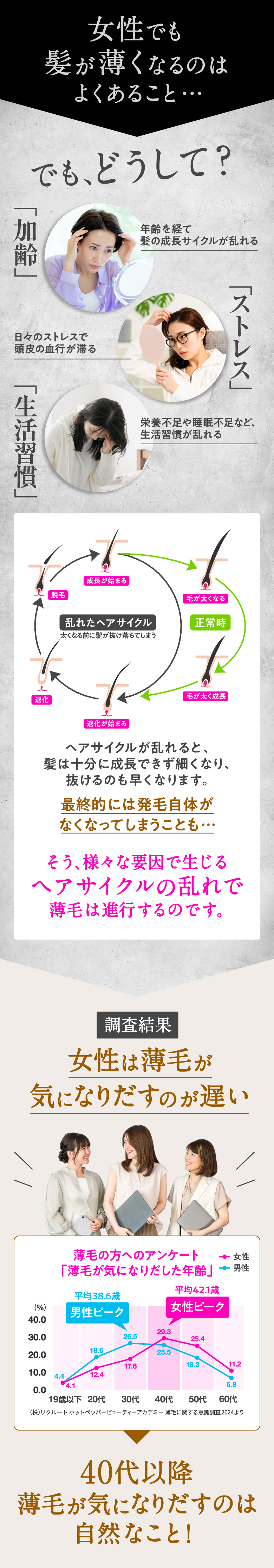 (男性に比べ女性に多く見られる甲状腺疾患による脱毛等、壮年性脱毛症以外の